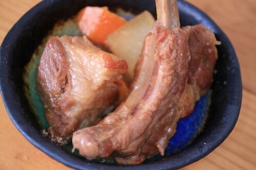 もとです。 ずいぶん前に「秘密のケンミンSHOW」にて放送された、鹿児島の郷土料理「とんこつ」を作ってみました。 とんこつと言っても豚の骨を食べるのではなく、豚の骨付きあばら肉を煮込んで食べる料理です。 豚の角煮とよく似ていますが、しょうゆメイン…